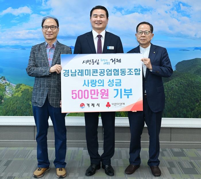 [½Ã»çÄÚ¸®¾ÆÀú³Î=Á¤Á¾¹Î ¼±ÀÓ±âÀÚ] °æ³² ·¹¹ÌÄܰø¾÷Çùµ¿Á¶ÇÕ(ÀÌ»çÀå ±è»ó°£)Àº 9ÀÏ °ÅÁ¦½ÃûÀ» ¹æ¹®ÇØ ÀÌ¿ô µ½±â ¼º±Ý 500¸¸ ¿øÀ» Àü´ÞÇß´Ù.
