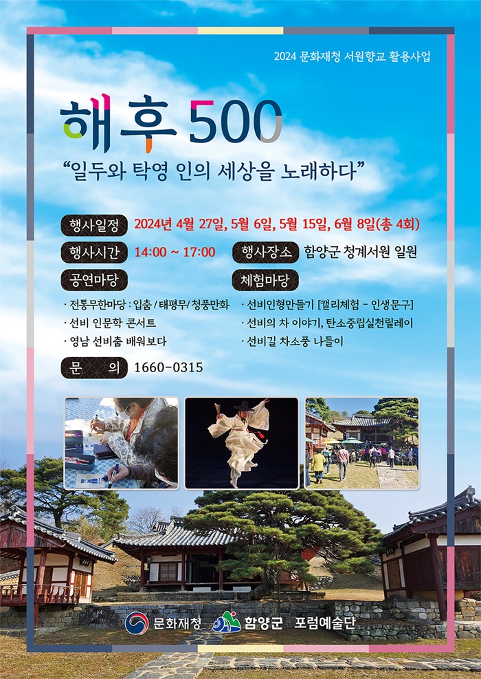 Æ÷·³¿¹¼ú´Ü¿¡¼ ÁÖÃÖÇÏ´Â ‘ÇØÈÄ 500. ÀÏµÎ¿Í Å¹¿µ ÀÎÀÇ ¼¼»óÀ» ³ë·¡ÇÏ´Ù’ ÇÁ·Î±×·¥Àº 2024 ¹®ÈÀçû ¼¿øÇâ±³ Ȱ¿ë»ç¾÷À¸·Î ¼±Á¤µÇ¾î ÃßÁø ÁßÀÎ »ç¾÷À¸·Î, ÇԾ籺 û°è¼¿ø ÀÏ¿ø¿¡¼ Áö³´Þ 27ÀÏÀ» ù ½ÃÀÛ ÈÄ ÀÌ´Þ 12Àϰú 15ÀÏ, 6¿ù 8ÀÏ µî 3Â÷·Ê ÁøÇàµÉ ¿¹Á¤ÀÌ´Ù.