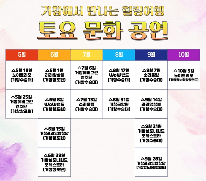 ¿ÃÇØ´Â °ø¿¬ Àå¼Ò¸¦ È®´ëÇØ °Åâ¼ö½Â´ë, °ÅââÆ÷¿ø, °ÅâÇ׳ëÈÈú¸µ·£µå¿¡¼ 5¿ùºÎÅÍ 10¿ù±îÁö Åä¿äÀÏ ¿ÀÈÄ 2½Ã¿¡ ÇÑ ½Ã°£ µ¿¾È Ŭ·¡½Ä, ¿ÀÄɽºÆ®¶ó, ±¹¾Ç µîÀÇ ¹«´ë°¡ ÆîÃÄÁú ¿¹Á¤ÀÌ´Ù.
