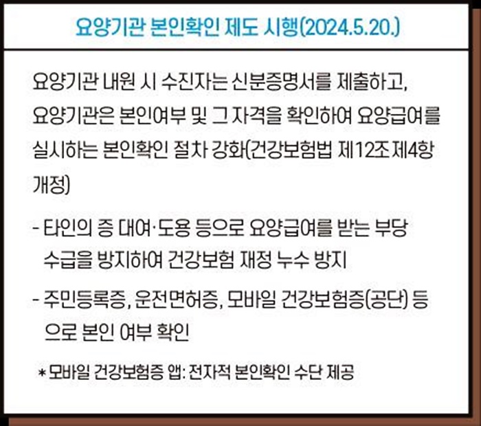 º´ÀÇ¿ø µî ¿ä¾ç±â°üÀº °³Á¤µÈ °Ç°º¸Çè¹ý¿¡ µû¶ó ȯÀÚ°¡ ã¾Æ¿À¸é °Ç°º¸ÇèÀ» Àû¿ëÇϱ⿡ ¾Õ¼ ½ÅºÐÁõ µîÀ¸·Î ȯÀÚ º»ÀÎ ¿©ºÎ¿Í °Ç°º¸Çè ÀÚ°Ý ¿©ºÎ¸¦ ¹Ýµå½Ã È®ÀÎÇØ¾ß ÇÑ´Ù.