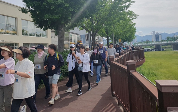 À̹ø Çà»ç´Â ‘ÇÔ²² °É¾î¿ä, ¼ºÆòµîÀÇ ±æ’À̶ó´Â ½½·Î°Ç ¾Æ·¡ °Åâ·ÎÅ͸®¿¡¼ Ãâ¹ßÇØ °Ç°èÁ¤À» ¹ÝȯÁ¡À¸·Î µ¹¾Æ¿À´Â ÄÚ½º·Î 100¿© ¸íÀÇ ±º¹ÎÀÌ Âü°¡Çß´Ù.