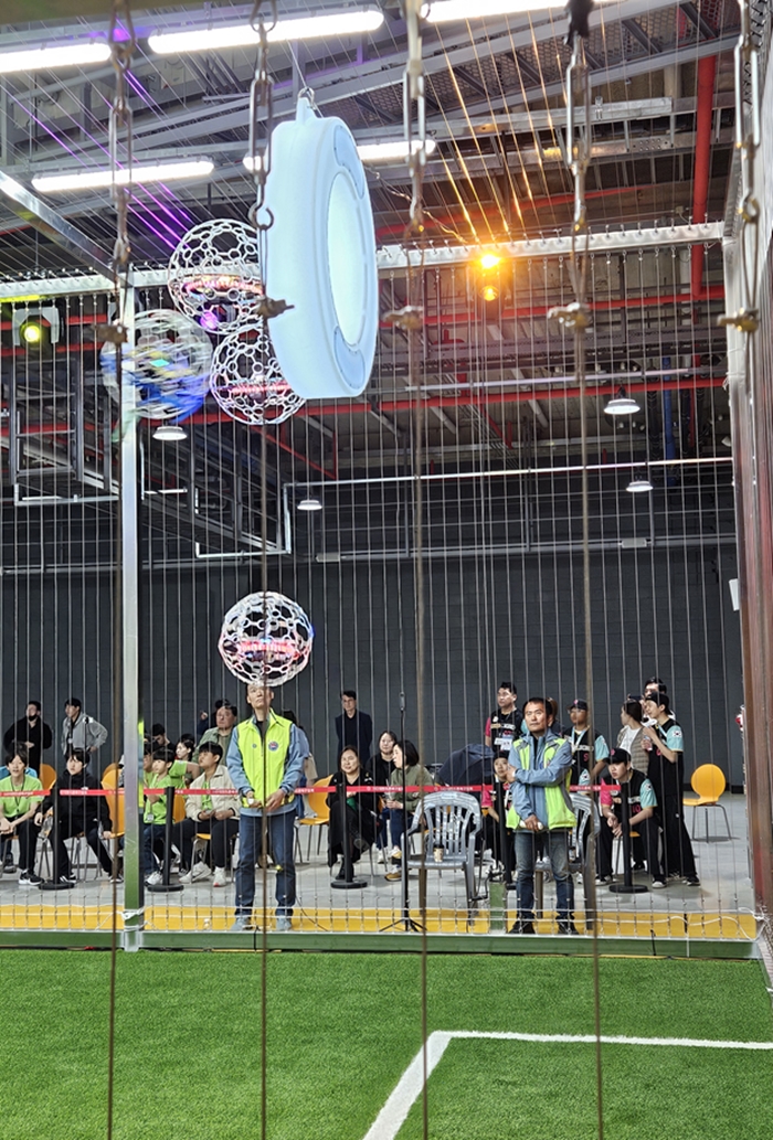 µå·ÐÃ౸´Â Ã౸°ø ¸ð¾ç µå·Ðº¼À» Á¶Á¾ÇØ 3m Á¤µµ ³ôÀÌ °øÁß¿¡ ¸Å´Þ¸° ¿øÇü °ñ´ë¿¡ Áý¾î³Ö¾î ½ÂºÎ¸¦ °¡¸®´Â ¹Ì·¡Çü ICT ·¹Àú½ºÆ÷Ã÷·Î À¯¼Ò³â´ëȸÀÇ °æ¿ì Àü¿ë °æ±âÀå(°¡·Î 8m, ¼¼·Î 4m, ³ôÀÌ 3m) ¾È¿¡¼ 5¸íÀÌ ÇÑ ÆÀÀ» ÀÌ·ç¾î 3ºÐ µ¿¾È ÁøÇàµÇ¸ç ªÀº ½Ã°£ °íµµÀÇ ÁýÁ߷°ú ÆÀ¿øµé °£ Çùµ¿½ÉÀ» ¿äÇϸç Â÷¼¼´ë E-½ºÆ÷Ã÷·Î Àα⸦ ¾ò°í ÀÖ´Ù.