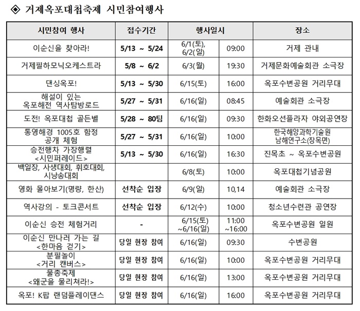 ÃàÁ¦ ¼¼ºÎÀÏÁ¤ È®ÀÎ ¹× Âü¿© ½ÅûÀº °ÅÁ¦½Ãû (www.geoje.go.kr) °ÅÁ¦½Ã¹®È¿¹¼úÀç´ÜȨÆäÀÌÁö(www.geojeart.or.kr) ¿¡¼ °¡´ÉÇϰí, ÀÏÁ¤ ¹× ½Åû¹æ¹ý °ü·Ã ÀÚ¼¼ÇÑ »çÇ×µéÀº °ÅÁ¦½Ã ¹®È¿¹¼ú°ú(055-639-3393) °ÅÁ¦½Ã¹®È¿¹¼úÀç´Ü(055-680-1030~2)À¸·Î ¹®ÀÇÇÏ¸é µÈ´Ù.