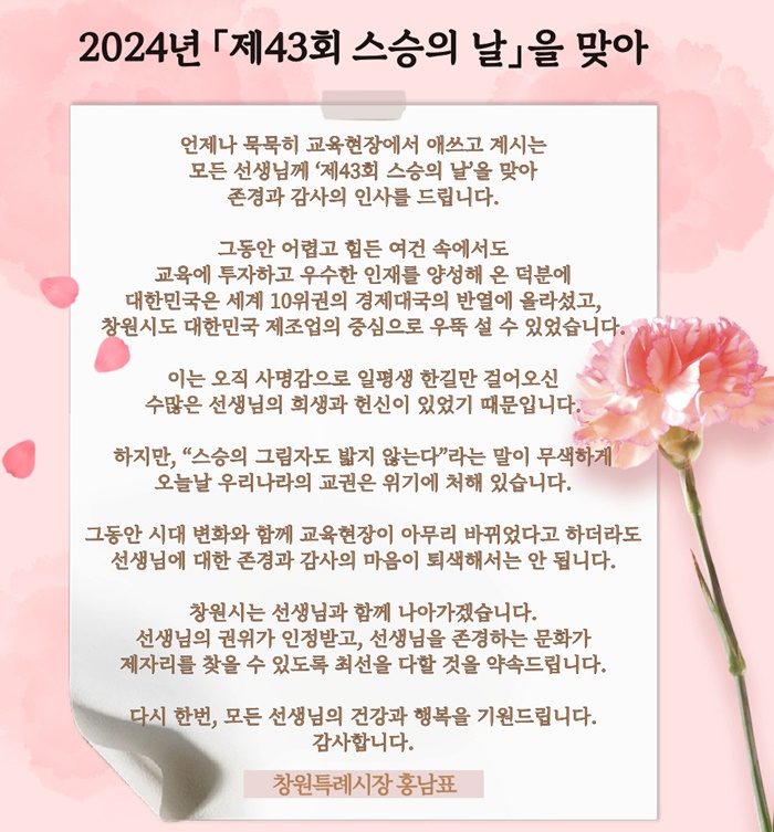 È« ½ÃÀåÀº “±×µ¿¾È ¾î·Æ°í Èûµç ¿©°Ç ¼Ó¿¡¼µµ ±³À°¿¡ ÅõÀÚÇϰí ÀÎÀ縦 ¾ç¼ºÇØ ¿Â ´öºÐ¿¡ â¿ø½Ã°¡ ´ëÇѹα¹ Á¦Á¶¾÷ÀÇ Áß½ÉÀ¸·Î ¿ì¶Ò ¼³ ¼ö ÀÖ¾ú°í, ÀÌ´Â ¿ÀÁ÷ »ç¸í°¨À¸·Î ÀÏÆò»ý Çѱ游 °É¾î¿À½Å ¼ö¸¹Àº ¼±»ý´ÔÀÇ Èñ»ý°ú Çå½ÅÀÌ ÀÖ¾ú±â ¶§¹®ÀÌ´Ù”¸ç Ç×»ó ´õ ³ªÀº ±³À°°ú ÇлýµéÀÇ ¹Ù¸¥ ¼ºÀåÀ» ÀεµÇϱâ À§ÇØ ³ë·ÂÇÏ´Â ±³À° ÇöÀåÀÇ ¼±»ý´Ôµé¿¡°Ô °¨»ç¿Í Á¸°æÀÇ ¶æÀ» Ç¥Çß´Ù.