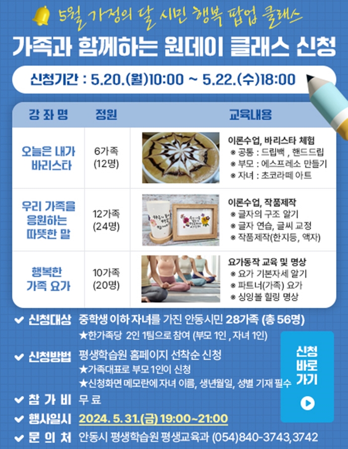 Âü¿©´ë»óÀº ÁßÇлý ÀÌÇÏ Àڳฦ °¡Áø ¾Èµ¿½Ã¹Î 28°¡Á·(56¸í)À̸ç, Âü°¡ºñ´Â Àü¾× ¹«·á´Ù. ¿øÈ°ÇÑ Çà»ç ¿î¿µÀ» À§ÇØ ÇÑ °¡Á·´ç Àοø¼ö´Â 2¸í(ºÎ¸ð 1ÀÎ, ÀÚ³à 1ÀÎ)À¸·Î Á¦ÇѵȴÙ.