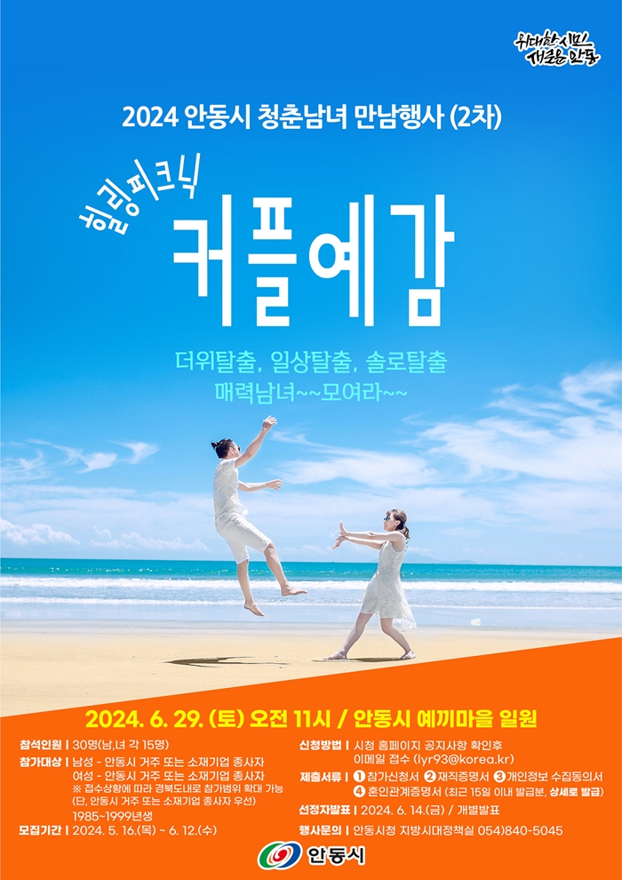 Âü°¡´ë»óÀº ¾Èµ¿¿¡ °ÅÁÖÇϰųª ¼ÒÀç ±â¾÷¿¡ Á¾»çÇÏ´Â 1985~1999³â»ý Á÷ÀåÀÎ ¹ÌÈ¥³²³àÀ̸ç, ³²³à °¢ 15¸íÀ¸·Î ÃÑ 30¸íÀ» ¸ðÁýÇÑ´Ù. Âü°¡Èñ¸ÁÀÚ´Â Âü°¡½Åû¼, ÀçÁ÷Áõ¸í¼, È¥Àΰü°èÁõ¸í¼ µî ½Åû¼·ù¸¦ ±¸ºñÇØ À̸ÞÀÏ(lyr93@korea.kr)·Î Á¦ÃâÇÏ¸é µÈ´Ù. ¼±Á¤ °á°ú´Â 6¿ù 14ÀÏ °³º° Å뺸ÇÒ ¿¹Á¤ÀÌ´Ù.