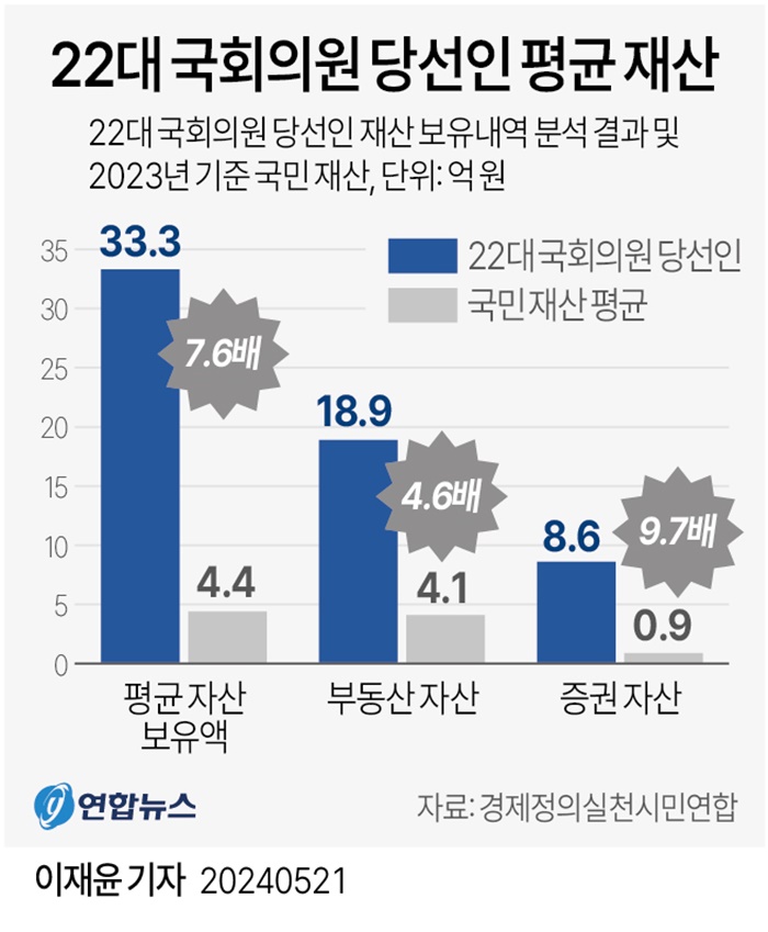 [½Ã»çÄÚ¸®¾ÆÀú³Î=Á¤Á¾¹Î ¼±ÀÓ±âÀÚ] 22´ë ±¹È¸ÀÇ¿ø ´ç¼±ÀεéÀÇ Æò±Õ Àç»êÀÌ ÀÏ¹Ý ±¹¹ÎÀÌ Æò±Õ ÀÚ»ê º¸À¯¾×º¸´Ù 7.6¹è ´õ ¸¹´Ù´Â ºÐ¼® °á°ú°¡ ³ª¿Ô´Ù.