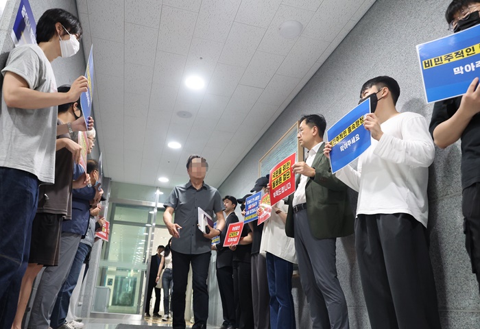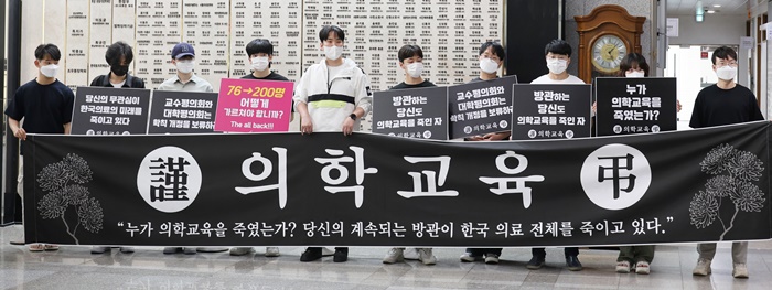 À̵éÀº 'ÀÇ´ë Áõ¿ø ¹Ý´ë', 'ÇÐÄ¢ °³Á¤ ¹Ý´ë' µîÀÇ ±¸È£¸¦ °£´ÜÇÏ°Ô ¿ÜÄ£ µÚ °¢ÀÚ 'ÁÖ¸Ô±¸±¸½Ä ÀÇ´ë Áõ¿øÀ» ¸·¾ÆÁÖ¼¼¿ä', 'ÇлýµéÀÇ ±³À°È¯°æÀ» ÁöÄÑÁÖ¼¼¿ä' µîÀÌ ¾²ÀÎ ¼ÕÆÖ¸»À» µé°í ÆòÀÇȸ°¡ ¿¸®´Â ´ëÇÐ º»ºÎ 1Ãþ ¾Õ¿¡ ±æ°Ô ´Ã¾î¼¹´Ù.