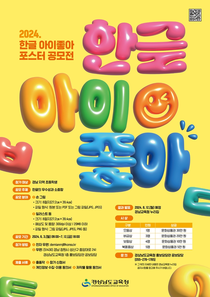 [½Ã»çÄÚ¸®¾ÆÀú³Î=Á¤Á¾¹Î ¼±ÀÓ±âÀÚ] °æ»ó³²µµ±³À°Ã»(±³À°°¨ ¹ÚÁ¾ÈÆ)Àº Çлý¿¡°Ô ÇѱÛÀÇ ¿ì¼ö¼º°ú ¼ÒÁßÇÔÀ» µÇ»õ±â°í À̸¦ ³Î¸® ¾Ë¸®°íÀÚ ¿ÃÇØ óÀ½À¸·Î ‘2024³â ÇÑ±Û ¾ÆÀÌÁÁ¾Æ Æ÷½ºÅÍ °ø¸ðÀü’À» ¿¬´Ù.