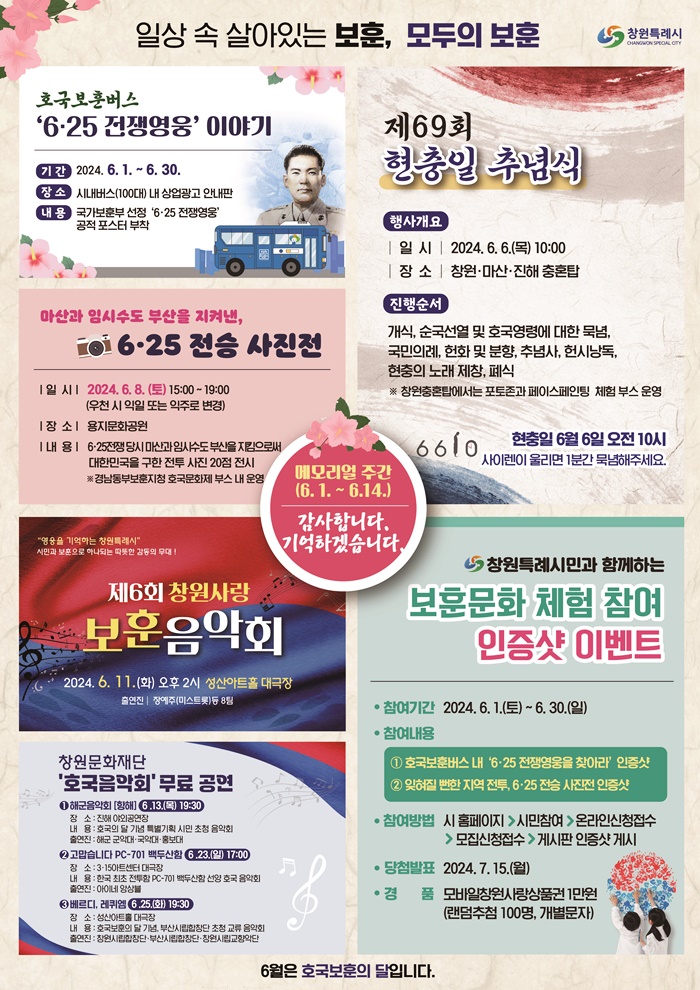 ¸ÕÀú, 6¿ù 1ÀϺÎÅÍ 6¿ù 14ÀϱîÁö ¸Þ¸ð¸®¾ó ÁÖ°£À» ¿î¿µÇØ 6¿ù ÇÑ ´Þ µ¿¾È ½Ã³»¹ö½º(100´ë) »ó¾÷ ±¤°í ¾È³»ÆÇ ÀÚ¸®¿¡ ±¹°¡º¸Èƺο¡¼ ¼±Á¤ÇÑ ‘6‧25 ÀüÀ￵¿õ’ °øÀû Æ÷½ºÅ͸¦ ºÎÂøÇϰí, 8ÀÏ ¿ÀÈÄ 3½ÃºÎÅÍ 7½Ã±îÁö ¿ëÁö¹®È°ø¿ø¿¡¼ ‘¸¶»ê°ú Àӽüöµµ ºÎ»êÀ» ÁöÄѳ½, 6‧25 Àü½Â »çÁøÀü’À» °³ÃÖÇØ Áö¿ªÀÇ ¼ÒÁßÇÑ ÀüÀï»ç¸¦ °æ³²µ¿ºÎº¸ÈÆÁöû È£±¹ ¹®ÈÁ¦ Çà»ç¿Í ÇÔ²² ¾Ë¸± ¿¹Á¤ÀÌ´Ù.
