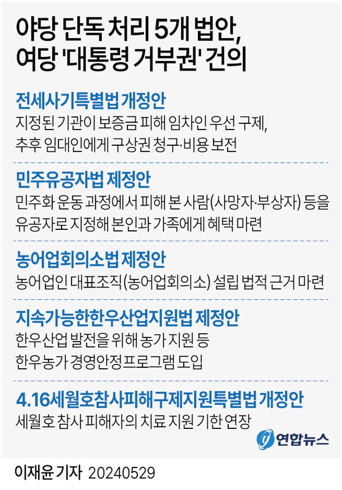 Á¤ºÎ´Â ±×·¯³ª ¹ÎÁÖÀ¯°øÀÚ¿¹¿ì°ü·Ã¹ý Á¦Á¤¾È, Àü¼¼»ç±âÇÇÇØÀÚÁö¿øÁְžÈÁ¤Æ¯º°¹ý °³Á¤¾È, Áö¼Ó°¡´ÉÇÑÇÑ¿ì»ê¾÷Áö¿ø¹ý Á¦Á¤¾È, ³ó¾î¾÷ȸÀǼҹý Á¦Á¤¾È µî ³ª¸ÓÁö 4°ÇÀº ÀǰáÇÏÁö ¾Ê°í À±¼®¿ ´ëÅë·É¿¡ ÀçÀǿ䱸±Ç Çà»ç¸¦ °ÇÀÇÇϱâ·Î Çß´Ù.