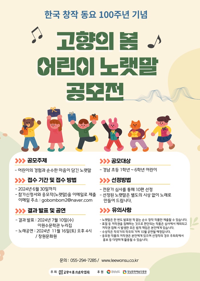 »ç´Ü¹ýÀÎ °íÇâÀǺ½±â³ä»ç¾÷ȸ°¡ ÁÖÃÖÇÏ°í °æ³²µµ¿Í °æ³²¹®È¿¹¼úÁøÈï¿øÀÌ ÈÄ¿øÇÏ´Â ‘°íÇâÀÇ º½ ¾î¸°ÀÌ ³ë·§¸» °ø¸ðÀü’Àº °æ³²ÀÇ ÃʵîÇб³ 1Çг⿡¼ 6Çг⠾ÀÌ¸é ´©±¸³ª Âü¿©ÇÒ ¼ö ÀÖ´Ù.