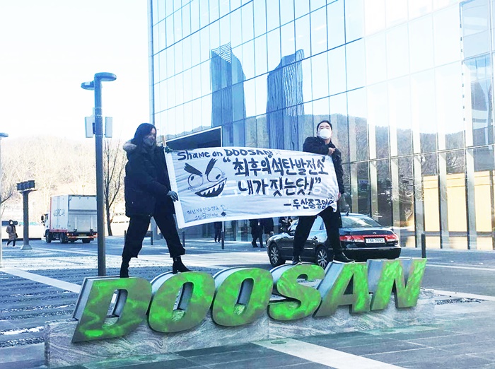 [½Ã»çÄÚ¸®¾ÆÀú³Î=Á¤Á¾¹Î ¼±ÀÓ±âÀÚ] ¼®Åº¹ßÀü¼Ò °Ç¼³À» ¹Ý´ëÇÏ¸ç µÎ»ê¿¡³Êºô¸®Æ¼(Àü µÎ»êÁß°ø¾÷) »ç¸íÀÌ ÀûÈù Á¶Çü¹°¿¡ ³ì»ö ½ºÇÁ·¹À̸¦ »Ñ¸° ±âÈÄ È°µ¿°¡µéÀ» Àç¹°¼Õ±«·Î ó¹úÇÒ ¼ö ¾ø´Ù´Â ´ë¹ý¿ø ÆÇ´ÜÀÌ ³ª¿Ô´Ù.