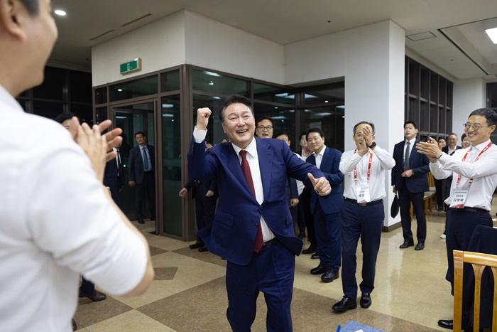 | À±¼®¿ ´ëÅë·ÉÀÌ 30ÀÏ Ãæ³² õ¾È Àç´É±³À°¿¬¼ö¿ø¿¡¼ ¿¸° Á¦22´ë ±¹¹ÎÀÇÈû ±¹È¸ÀÇ¿ø ¿öÅ©¼ó¿¡¼ ¸¸ÂùÀ» ¸¶Ä£ µÚ ¾îÆÛÄÆ ¼¼¸®¸Ó´Ï¸¦ Çϰí ÀÖ´Ù. /´ëÅë·É½Ç Á¦°ø |