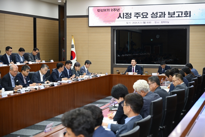 [½Ã»çÄÚ¸®¾ÆÀú³Î=Á¤Á¾¹Î ¼±ÀÓ±âÀÚ] °ÅÁ¦½Ã(½ÃÀå ¹ÚÁ¾¿ì)´Â 3ÀÏ, ½Ãû ÁßȸÀǽǿ¡¼ ½ÃÀå ¹× ºÎ½ÃÀå, ±¹・¼ÒÀå, Àü ºÎ¼ÀåÀÌ Âü¼®ÇÑ °¡¿îµ¥ ‘¹Î¼± 8±â 2Áֳ⠼º°úº¸°íȸ’¸¦ °³ÃÖÇß´Ù.