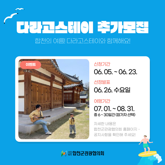‘´Ù¶ó°í(Go!) ½ºÅ×ÀÌ’´Â ‘°æ³² ÇÑ ´Þ ¿©ÇàÇϱ⠻ç¾÷’ÀÇ ÀÏȯÀ¸·Î (»ç)ÇÕõ±º°ü±¤ÇùÀÇȸ¿¡¼ ÃßÁøÇÑ´Ù. ÇÕõ¿¡¼ 6ÀÏ¿¡¼ 30Àϰ£ ¸Ó¹°¸ç °ü±¤Áö ¹æ¹®, °¢Á¾ üÇèȰµ¿, ¼÷¹Ú µî °³º° ÀÚÀ¯¿©ÇàÀ» Çϰí ÁÖ¾îÁø °úÁ¦¸¦ ¼öÇàÇÏ¸é ¼÷¹Úºñ(1ÀÏ 5¸¸¿ø À̳», ÆÀ´ç 1~2¸í)¿Í üÇèºñ(1Àδç 7~10¸¸¿ø)¸¦ Áö¿øÇÑ´Ù.