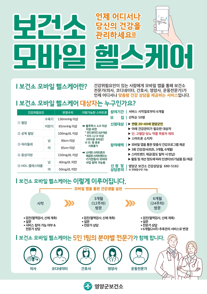 [½Ã»çÄÚ¸®¾ÆÀú³Î=±è¿¬ÇÐ ±âÀÚ] ¿µ¾ç±ºº¸°Ç¼Ò´Â Áö¿ªÁÖ¹ÎÀÇ ¸¸¼ºÁúȯ ¿¹¹æ°ü¸®¸¦ À§ÇØ ‘2024³â ¸ð¹ÙÀÏ ÇコÄɾî»ç¾÷’½Å±Ô Âü¿©ÀÚ 50¸íÀ» ¸ðÁýÇÑ´Ù°í 31ÀÏ ¹àÇû´Ù.