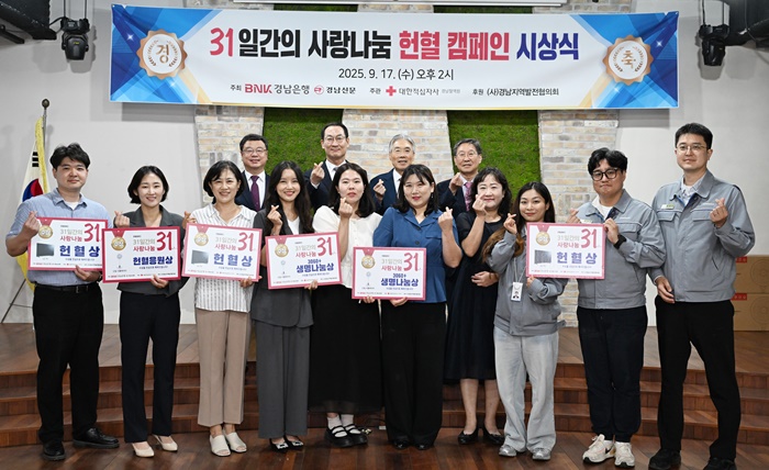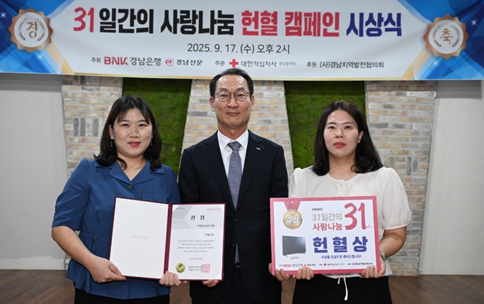 [½Ã»çÄÚ¸®¾ÆÀú³Î=Á¤Á¾¹Î ¼±ÀÓ±âÀÚ] °ÅÁ¦½Ã´Â Áö³ 17ÀÏ °æ³²½Å¹®»ç 1Ãþ Ȧ¿¡¼ ¿¸° '2025³â 31Àϰ£ÀÇ »ç¶û³ª´® ÇåÇ÷Ä·ÆäÀÎ' ½Ã»ó½Ä¿¡¼ ¿ì¼ö´Üü·Î ¼±Á¤µÅ °æ³²ÀºÇàÀå ǥâÀ» ¼ö»óÇß´Ù.
