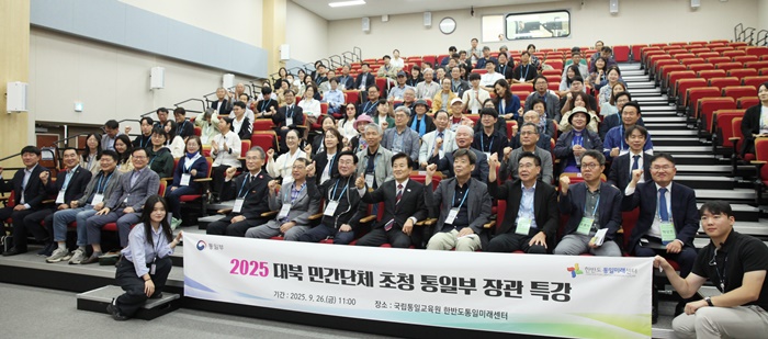 | Á¤µ¿¿µ ÅëÀϺΠÀå°üÀÌ 26ÀÏ °æ±â ¿¬Ãµ±º ±¹¸³ÅëÀϱ³À°¿ø ÇѹݵµÅëÀϹ̷¡¼¾ÅÍ¿¡¼ ¿¸° '³²ºÏ »çȸ¹®È±³·ù ¹× ´ëºÏ ÀεµÁö¿ø´Üü ÃÊû Çà»ç'¿¡ Âü¼®ÇØ 'ÆòÈ °øÁ¸°ú ¹ø¿µÀÇ Çѹݵµ¸¦ ±¸ÇöÇϱâ À§ÇÑ °úÁ¦'¸¦ ÁÖÁ¦·Î Ưº° °¿¬À» ¸¶Ä£ ÈÄ Âü¼®ÀÚµé°ú ±â³ä ÃÔ¿µÇϰí ÀÖ´Ù. /ÅëÀϺΠÁ¦°ø |