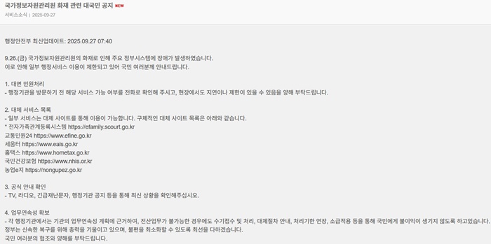 (¼¿ï=¿¬ÇÕ´º½º) ±è¼º¹Î ±âÀÚ = 26ÀÏ ±¹°¡Á¤º¸ÀÚ¿ø°ü¸®¿ø ´ëÀü º»¿ø¿¡ ÀÖ´Â Àü»ê½Ç¿¡¼ ¹ß»ýÇÑ ÈÀç·Î Á¤ºÎ ¾÷¹«½Ã½ºÅÛ 647°³°¡ °¡µ¿ÀÌ Áß´ÜµÈ °ÍÀ¸·Î ÆÄ¾ÇµÆ´Ù. 27ÀÏ ¼¿ï ½Ã³» ÇÑ ÁöÇÏö¿ª¿¡ ¼³Ä¡µÈ ¹«Àιοø¹ß±Þ±â¿¡ ½Ã½ºÅÛ ¿À·ù ¹®ÀÚ°¡ Ç¥½ÃµÇ°í ÀÖ´Ù. 2025.9.27 ksm7976@yna.co.kr