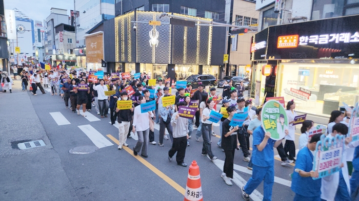ÆÛÆ÷¸Õ½º¿¡´Â ±¹¸³°æ±¹´ëÇб³ ±³Á÷¿ø°ú Çлý, ±³À° °ü·Ã ´Üü, ½Ã¹Î µî ¸Åȸ ¾à 200¸íÀÌ ÀÇ»ç °¡¿î°ú ¼ö¼úº¹, ¸Ó¸®¶ì¸¦ Âø¿ëÇϰí, ±¸È£°¡ ÀûÈù ¼ÕÇÇÄÏÀ» µé°í Âü¿©Çß´Ù. Âü¿©ÀÚµéÀº “ÀÇ´ë À¯Ä¡, °æºÏ ¾Èµ¿”, “ÀÇ´ë À¯Ä¡, ´Ù ÇÔ²²”¶ó´Â ±¸È£¸¦ ¿ÜÄ¡¸ç ¿øµµ½ÉÀ» ÇàÁøÇÏ¿© ÃàÁ¦ÀåÀ» ãÀº ±¹³»¿Ü °ü±¤°´°ú ½Ã¹ÎµéÀÇ À̸ñÀ» ²ø¾ú´Ù. ½Ã¹Îµéµµ Áï¼®¿¡¼ ÇÔ²² ÇàÁø¿¡ µ¿ÂüÇÏ¸é¼ ÆÛ·¹À̵åÀÇ Àǹ̸¦ ´õÇß´Ù.