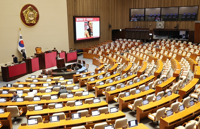 ±¹¹ÎÀÇÈû ±èÀºÇý ÀÇ¿øÀÌ 29ÀÏ ±¹È¸ º»È¸ÀÇÀå¿¡¼ '±¹È¸¿¡¼ÀÇ Áõ¾ð·°¨Á¤ µî¿¡ °üÇÑ ¹ý·ü ÀϺΰ³Á¤¹ý·ü¾È¿¡ ´ëÇÑ ¼öÁ¤¾È'¿¡ ´ëÇØ ¹«Á¦ÇÑ Åä·ÐÀ» À̾°í ÀÖÁö¸¸ ±¹È¸ÀÇ¿ø¼®Àº ÅÖ ºñ¾îÀÖ´Ù. /¿¬ÇÕ´º½º |