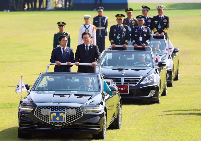 ÀÌÀç¸í ´ëÅë·ÉÀÌ 1ÀÏ Ãæ³² °è·æ´ë ´ë¿¬º´Àå¿¡¼ ¿¸° °Ç±º 77Áֳ⠱¹±ºÀÇ ³¯ ±â³äÇà»ç¿¡¼ ¿º´Â÷·®¿¡ ž½ÂÇØ ÀÖ´Ù. ¿ÞÂÊÀº ¾È±Ô¹é ±¹¹æºÎ Àå°ü /¿¬ÇÕ´º½º |