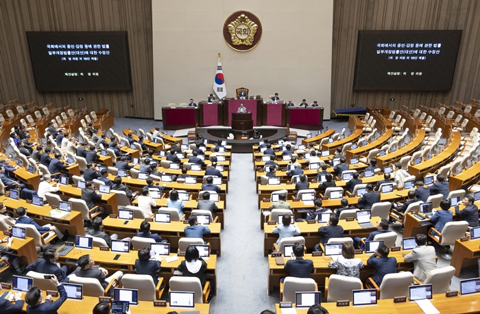 Áö³´Þ 28ÀÏ ±¹È¸ º»È¸ÀÇ¿¡ ±¹È¸¿¡¼ÀÇ Áõ¾ð·°¨Á¤ µî¿¡ °üÇÑ ¹ý·ü ÀϺΰ³Á¤¹ý·ü¾È¿¡ ´ëÇÑ ¼öÁ¤¾ÈÀÌ »óÁ¤µÇ¾î Á¦¾È¼³¸íÀ» Çϰí ÀÖ´Ù. /¿¬ÇÕ´º½º |