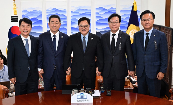 ´õºÒ¾î¹ÎÁÖ´ç ±èº´±â ¿ø³»´ëÇ¥(¿ÞÂÊ µÎ ¹øÂ°)¿Í ±¹¹ÎÀÇÈû ¼Û¾ð¼® ¿ø³»´ëÇ¥(¿ÞÂÊ ³× ¹øÂ°)°¡ 13ÀÏ ±¹È¸¿¡¼ ¿ì¿ø½Ä ±¹È¸ÀÇÀå(°¡¿îµ¥) ÁÖÀç·Î ¿¸° ¿©¾ß ±³¼·´Üü ¿ø³»´ëÇ¥ ȸµ¿¿¡¼ ¸¸³ª ±â³ä ÃÔ¿µÇϰí ÀÖ´Ù. (¿ÞÂʺÎÅÍ) ´õºÒ¾î¹ÎÁÖ´ç ¹®Áø¼® ¿ø³»¿î¿µ¼ö¼®, ±è ¿ø³»´ëÇ¥, ¿ì ÀÇÀå, ±¹¹ÎÀÇÈû ¼Û ¿ø³»´ëÇ¥, À¯»ó¹ü ¿ø³»¿î¿µ¼ö¼®. /°øµ¿ÃëÀç |