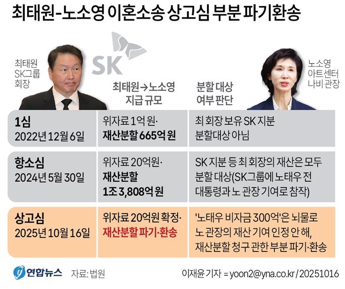 ÃÖÅ¿ø(65) SK±×·ì ȸÀåÀÌ ³ë¼Ò¿µ(64) ¾ÆÆ®¼¾ÅÍ ³ªºñ °üÀå¿¡°Ô ÀÌÈ¥¿¡ µû¸¥ Àç»êºÐÇÒ·Î 1Á¶3õ¾ï¿øÀÌ ³Ñ´Â µ·À» Áö±ÞÇ϶ó´Â 2½É ÆÇ°áÀÌ ´ë¹ý¿ø¿¡¼ ±úÁ³´Ù.