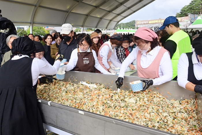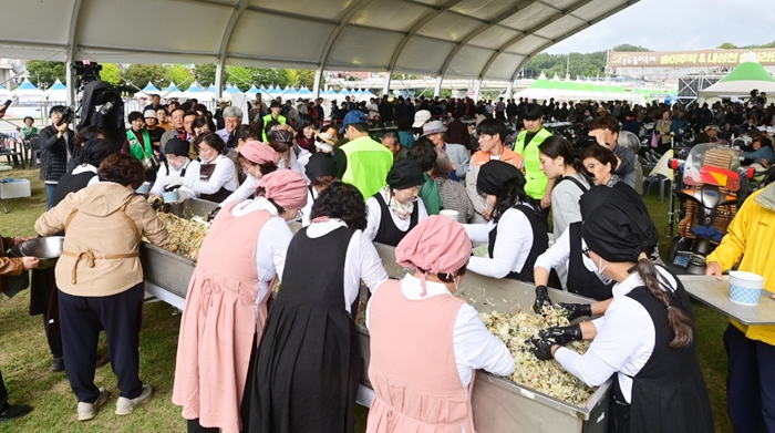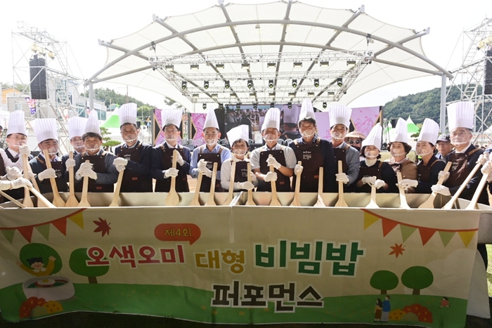 À̹ø ÆÛÆ÷¸Õ½º´Â ºÀÈÀÇ ´ëÇ¥ ³ó·Ãà»ê¹°ÀÎ ¼ÛÀ̹ö¼¸°ú ÇѾà¿ì¸¦ ÁÖÀç·á·Î Ȱ¿ëÇØ 500ÀκР±Ô¸ðÀÇ ´ëÇü ºñºö¹äÀ» Á¶¸®ÇØ °ü±¤°´°ú ±º¹Îµé¿¡°Ô ³ª´©´Â Çà»ç·Î, ÃàÁ¦ÀÇ ¼¸·À» È·ÁÇÏ°Ô ¿¾ú´Ù. ÁغñµÈ ºñºö¹äÀ» ÇÔ²² ºñºñ°í ³ª´©¸ç ÈÇÕ°ú dz¿äÀÇ Àǹ̸¦ µÇ»õ±â´Â ½Ã°£ÀÌ µÆ´Ù.