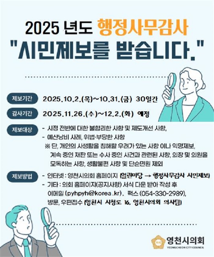 [½Ã»çÄÚ¸®¾ÆÀú³Î=°æºÏÃëÀ纻ºÎ] ¿µÃµ½ÃÀÇȸ(ÀÇÀå ±è¼±ÅÂ)´Â 2025³âµµ ÇàÁ¤»ç¹«°¨»ç¸¦ ¾ÕµÎ°í 10¿ù 31ÀϱîÁö ½Ã¹ÎÁ¦º¸¸¦ ¹Þ´Â´Ù.