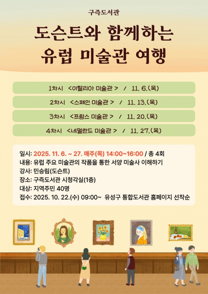 [½Ã»çÄÚ¸®¾ÆÀú³Î=À̼±¿ì ±âÀÚ] ´ëÀü À¯¼º±¸(±¸Ã»Àå Á¤¿ë·¡)´Â 11¿ù 6ÀϺÎÅÍ 27ÀϱîÁö ¸ÅÁÖ ¸ñ¿äÀÏ ±¸Áïµµ¼°ü¿¡¼ ‘µµ½¼Æ®¿Í ÇÔ²²ÇÏ´Â À¯·´ ¹Ì¼ú°ü ¿©Çà’ °¿¬À» °³ÃÖÇÑ´Ù.