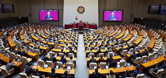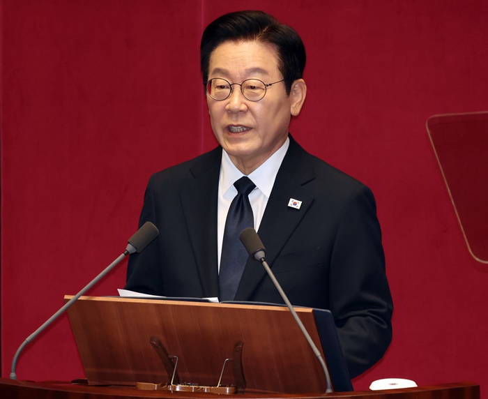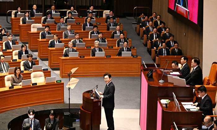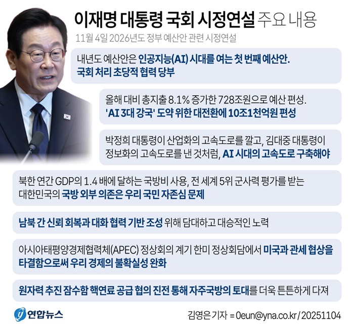 | ÀÌÀç¸í ´ëÅë·ÉÀÌ 4ÀÏ ±¹È¸ º»È¸ÀÇÀå¿¡¼ 2026³âµµ Á¤ºÎ ¿¹»ê¾È ½ÃÁ¤¿¬¼³À» Çϰí ÀÖ´Ù. ¿À¸¥ÂÊ ±¹¹ÎÀÇÈû ÀÚ¸®´Â ÀÇ¿øµé ºÒÂüÀ¸·Î ºñ¾î ÀÖ´Ù. /¿¬ÇÕ´º½º |