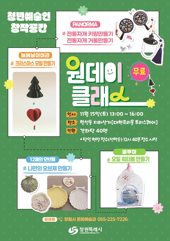 ¿ÃÇØ 2¿ù °ø¸ð¸¦ ÅëÇØ û³â¿¹¼úÀΠâÀÛ°ø°£¿¡ ÀÔÁÖÇÑ Ã»³â ¿¹¼úÀÎ 4ÆÀ(5¸í)ÀÇ ÀÛ°¡°¡ Á÷Á¢ ±âȹÇÏ°í ¿î¿µÇÏ´Â ¿øµ¥ÀÌŬ·¡½º´Â ¡ãÀüÅëÀÚ°³ ۸µ¸¸µé±â ¡ãÀüÅëÀÚ°³ °Å¿ï¸¸µé±â ¡ãÅ©¸®½º¸¶½º ¸ðºô ¸¸µé±â ¡ã³ª¸¸ÀÇ ¿ÀºêÁ¦ ¸¸µé±â ¡ã¿ÀÀÏ ¿öÅͺ¼ ¸¸µé±â ÃÑ 5°³ ÇÁ·Î±×·¥À¸·Î ÁøÇàµÈ´Ù.