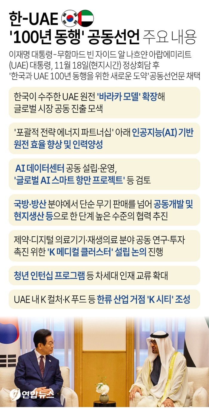 ÀÌÀç¸í ´ëÅë·É°ú ¹«ÇÔ¸¶µå ºó ÀÚÀÌµå ¾Ë ³ªÈå¾á ¾Æ¶ø¿¡¹Ì¸®Æ®(UAE) ´ëÅë·ÉÀº 18ÀÏ(ÇöÁö½Ã°£) ¾ÆºÎ´Ùºñ¿¡¼ Á¤»óȸ´ãÀ» °®°í 'Çѱ¹°ú UAE 100³â µ¿ÇàÀ» À§ÇÑ »õ·Î¿î µµ¾à'À̶ó´Â ¸íĪÀÇ °øµ¿¼±¾ð¹®À» äÅÃÇß´Ù.