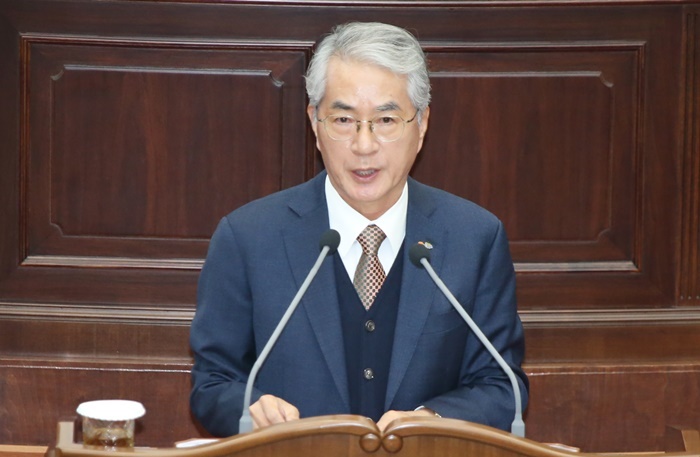 | ¹ÚÁ¾ÈÆ °æ³²±³À°°¨ÀÌ 19ÀÏ °æ³²µµÀÇȸ º»È¸ÀÇ¿¡¼ ½ÃÁ¤¿¬¼³À» Çϰí ÀÖ´Ù. |