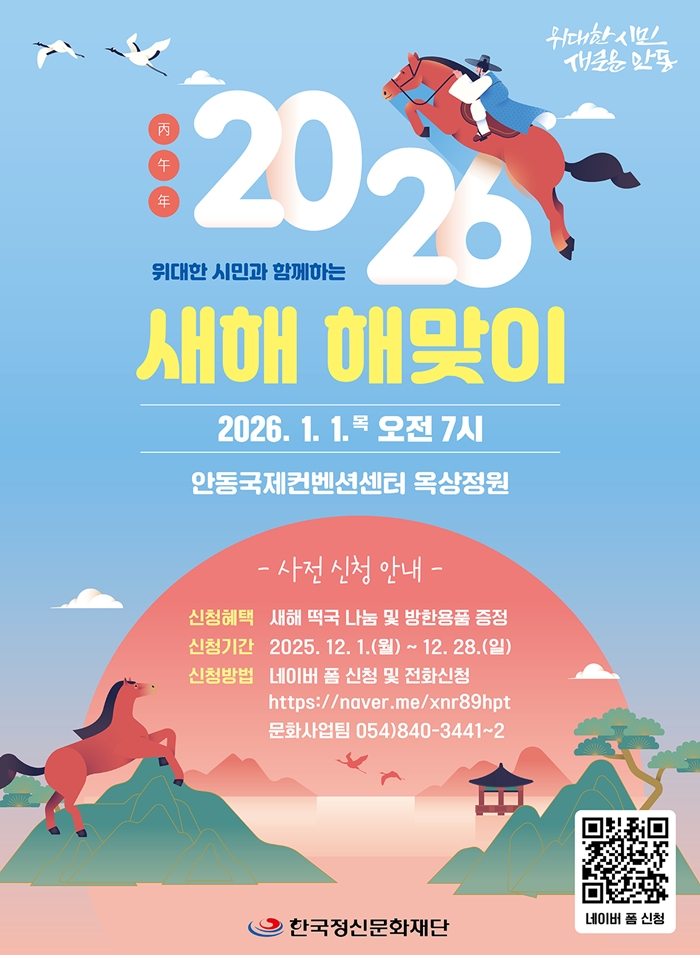[½Ã»çÄÚ¸®¾ÆÀú³Î=±è¿¬ÇÐ ±âÀÚ] ¾Èµ¿½Ã°¡ ÁÖÃÖÇϰí Çѱ¹Á¤½Å¹®ÈÀç´ÜÀÌ ÁÖ°üÇÏ´Â ‘À§´ëÇÑ ½Ã¹Î°ú ÇÔ²²ÇÏ´Â 2026 »õÇØ ÇØ¸ÂÀÌ’ Çà»ç°¡ 2026³â 1¿ù 1ÀÏ(¸ñ) ¿ÀÀü 7½Ã, ¾Èµ¿±¹Á¦ÄÁº¥¼Ç¼¾ÅÍ ¿Á»óÁ¤¿ø¿¡¼ ¿¸°´Ù.