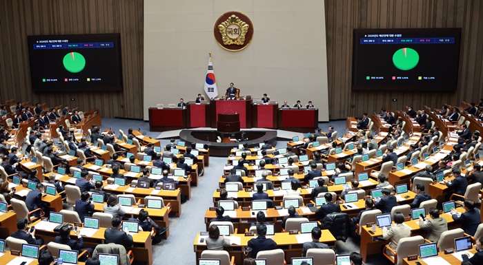 | ¿¹»ê¾È ó¸® ¹ýÁ¤ ½ÃÇÑÀÎ 2ÀÏ ±¹È¸ º»È¸ÀÇ¿¡¼ 2026³âµµ ¿¹»ê¾È¿¡ ´ëÇÑ ¼öÁ¤¾ÈÀÌ Âù¼º 248ÀÎ, ¹Ý´ë 8ÀÎ, ±â±Ç 6ÀÎÀ¸·Î °¡°áµÇ°í ÀÖ´Ù |