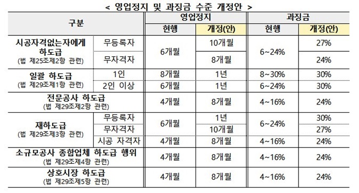 °³Á¤¾ÈÀº ºÒ¹ý Çϵµ±Þ ÇàÀ§ÀÚ¿¡ ´ëÇÑ ¿µ¾÷Á¤Áö¸¦ ÇöÇà 4∼8°³¿ù¿¡¼ ÃÖ¼Ò 8°³¿ù∼ÃÖ´ë 1³âÀ¸·Î, °ú¡±ÝÀ» Àüü Çϵµ±Þ´ë±ÝÀÇ 4∼30%¿¡¼ 24∼30%·Î »óÇâÇÏ´Â ³»¿ëÀ» ´ã¾Ò´Ù.
