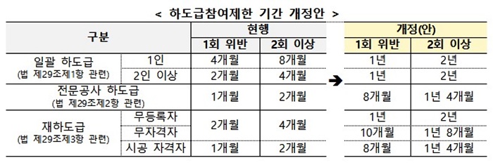¾Æ¿ï·¯ °³Á¤¾ÈÀº ºÒ¹ýÇϵµ±ÞÀ¸·Î ÇàÁ¤Ã³ºÐÀ» ¹ÞÀ» ½Ã °ø°ø °Ç¼³ °ø»ç Çϵµ±Þ Âü¿© Á¦ÇÑ ±â°£À» ÇöÇà 1∼8°³¿ù¿¡¼ 8°³¿ù∼2³âÀ¸·Î »óÇâÇß´Ù.