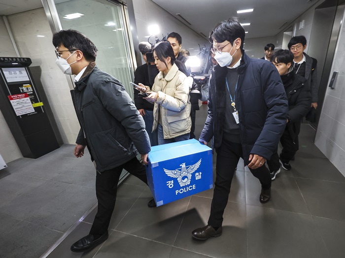 | 9ÀÏ ¿ÀÈÄ ¾Ð¼ö¼ö»öÀÌ ÁøÇàÁßÀÎ ¼ÛÆÄ±¸ ÄíÆÎ º»»ç¿¡¼ °æÂû °ü°èÀÚµéÀÌ »óÀÚ¸¦ µé°í ³ª¼°í ÀÖ´Ù. /°øµ¿ÃëÀç |