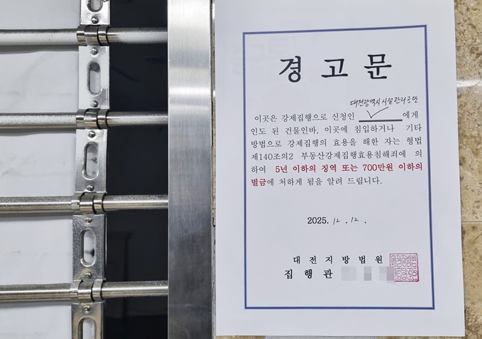 | 12ÀÏ »õº® ¹ý¿øÀÌ ´ëÀü Áß¾Ó·ÎÁöÇϵµ»ó°¡ ³» ¹«´Ü Á¡À¯ Á¡Æ÷¿¡ ´ëÇØ °Á¦ÁýÇàÀ» ³¡³½ µÚ °æ°íÀåÀ» ºÙÀÎ ¸ð½À. /¿¬ÇÕ´º½º |