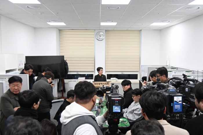 | ¹ÚÁ¤Çö ´õºÒ¾î¹ÎÁÖ´ç ´ëÀü½Ã´çÀ§¿øÀåÀÌ 22ÀÏ ´ëÀü½ÃÀÇȸ¿¡¼ ±âÀÚȸ°ßÀ» ¿°í ´ëÀü·Ãæ³² ÇàÁ¤ÅëÇÕ ÃßÁø °ü·Ã ¹ß¾ðÀ» Çϰí ÀÖ´Ù |