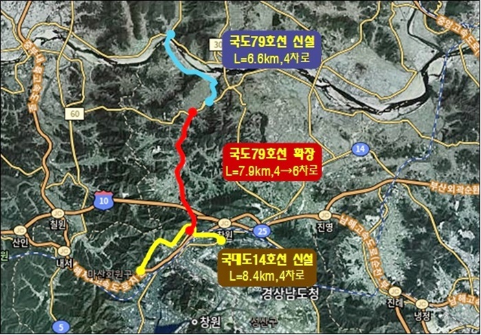 À̹ø¿¡ ¼±Á¤µÈ ³ë¼±Àº ¡â±¹µµ 14È£¼± ´ëü ¿ìȸµµ·Î ÇÕ¼º~µ¿À¾(8.4km) ½Å¼³ ¡â±¹µµ 79È£¼± µ¿Á¤~ºÏ¸é(7.9km) È®Àå ¡â±¹µµ 79È£¼± â¿ø ºÏ¸é~â³ç ºÎ°î(6.6km) ½Å¼³·Î, ÃÑ¿¬Àå 22.9km, »ç¾÷ºñ 6,675¾ï ¿ø ±Ô¸ð´Ù.