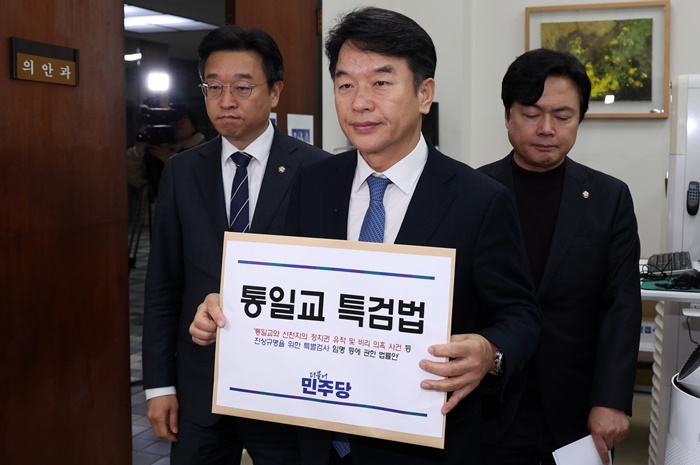 | ´õºÒ¾î¹ÎÁÖ´ç ¹®Áø¼® ¿ø³»¿î¿µ¼ö¼®ºÎ´ëÇ¥°¡ 26ÀÏ ¼¿ï ¿©Àǵµ ±¹È¸»ç¹«Ã³ ÀǾȰú¿¡¼ ÅëÀϱ³ Ư°Ë¹ý¾ÈÀ» Á¦ÃâÇϰí ÀÖ´Ù. /°øµ¿ÃëÀç |