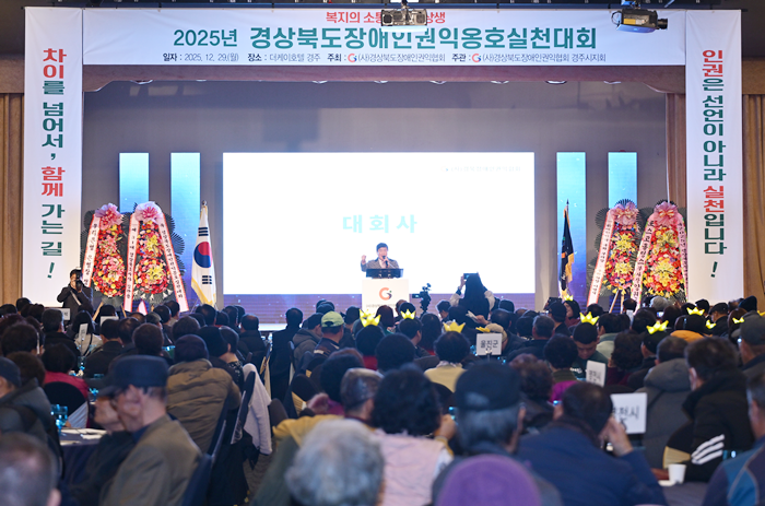 [½Ã»çÄÚ¸®¾ÆÀú³Î=±è¿¬ÇÐ ±âÀÚ] °æºÏµµ´Â 29ÀÏ °æÁÖ ´õÄÉÀÌÈ£ÅÚ¿¡¼ °æ»óºÏµµÀå¾ÖÀαÇÀÍÇùȸ ÁÖÃÖ·Î Àå¾ÖÀΠȸ¿ø°ú ÀÚ¿øºÀ»çÀÚ µî 1,000¿© ¸íÀÌ Âü¼®ÇÑ °¡¿îµ¥ ‘2025³â °æ»óºÏµµ Àå¾ÖÀÎ ±ÇÀÍ¿ËÈ£ ½Çõ´ëȸ’¸¦ ¼ºÈ²¸®¿¡ °³ÃÖÇß´Ù.