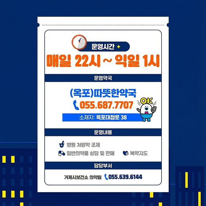 2026³âºÎÅÍ´Â °ø°ø¾ß°£·½É¾ß¾à±¹À» ±âÁ¸ °ÅÁ¦ÇÁ¶óÀھ౹¿¡¼ ¿ÁÆ÷¿¡ ¼ÒÀçÇÑ ‘µû¶æÇѾ౹’À¸·Î º¯°æ ÁöÁ¤ÇÏ¿© ¿î¿µÇÑ´Ù. ¿î¿µ½Ã°£Àº ¸ÅÀÏ ¹ã 10½ÃºÎÅÍ ´ÙÀ½ ³¯ ¿ÀÀü 1½Ã±îÁö·Î, ±âÁ¸º¸´Ù 1½Ã°£ ¿¬ÀåÇÏ¿© ¿î¿µµÉ ¿¹Á¤ÀÌ´Ù.