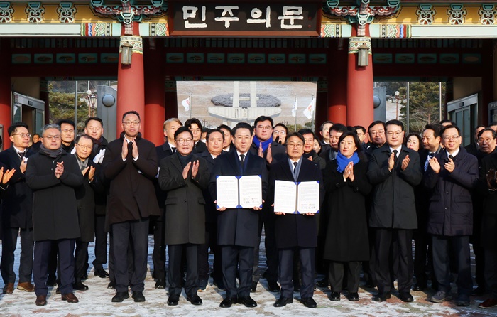 ° ½ÃÀå°ú ±è Áö»ç´Â À̳¯ ¿ÀÀü ±¤ÁÖ ±¹¸³ 5·18¹ÎÁÖ¹¦Áö¿¡¼ »õÇØ ÇÕµ¿ Âü¹èÇϰí '±¤ÁÖ·Àü³² ÅëÇÕ Áö¹æÁ¤ºÎ ÃßÁø °øµ¿¼±¾ð¹®'À» ¹ßÇ¥Çß´Ù.