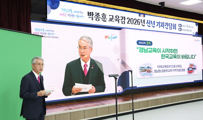 ¹ÚÁ¾ÈÆ °æ³²µµ±³À°°¨ÀÌ 2026³â »õÇØ¸¦ ¸Â¾Æ °æ³²±³À° 12³âÀ» µ¹¾Æº¸°í, ³²Àº Àӱ⸦ ¼³°èÇÏ´Â ±âÀÚ °£´ãȸ¿¡¼ ¸»¹®À» ÀÌ·¸°Ô ¿¸é¼ ¹Ì·¡±³À°ÀÇ Áö¼Ó°¡´É¼º¿¡ ´ëÇÑ °·ÂÇÑ ÀÇÁö¸¦ Ç¥¸íÇß´Ù.